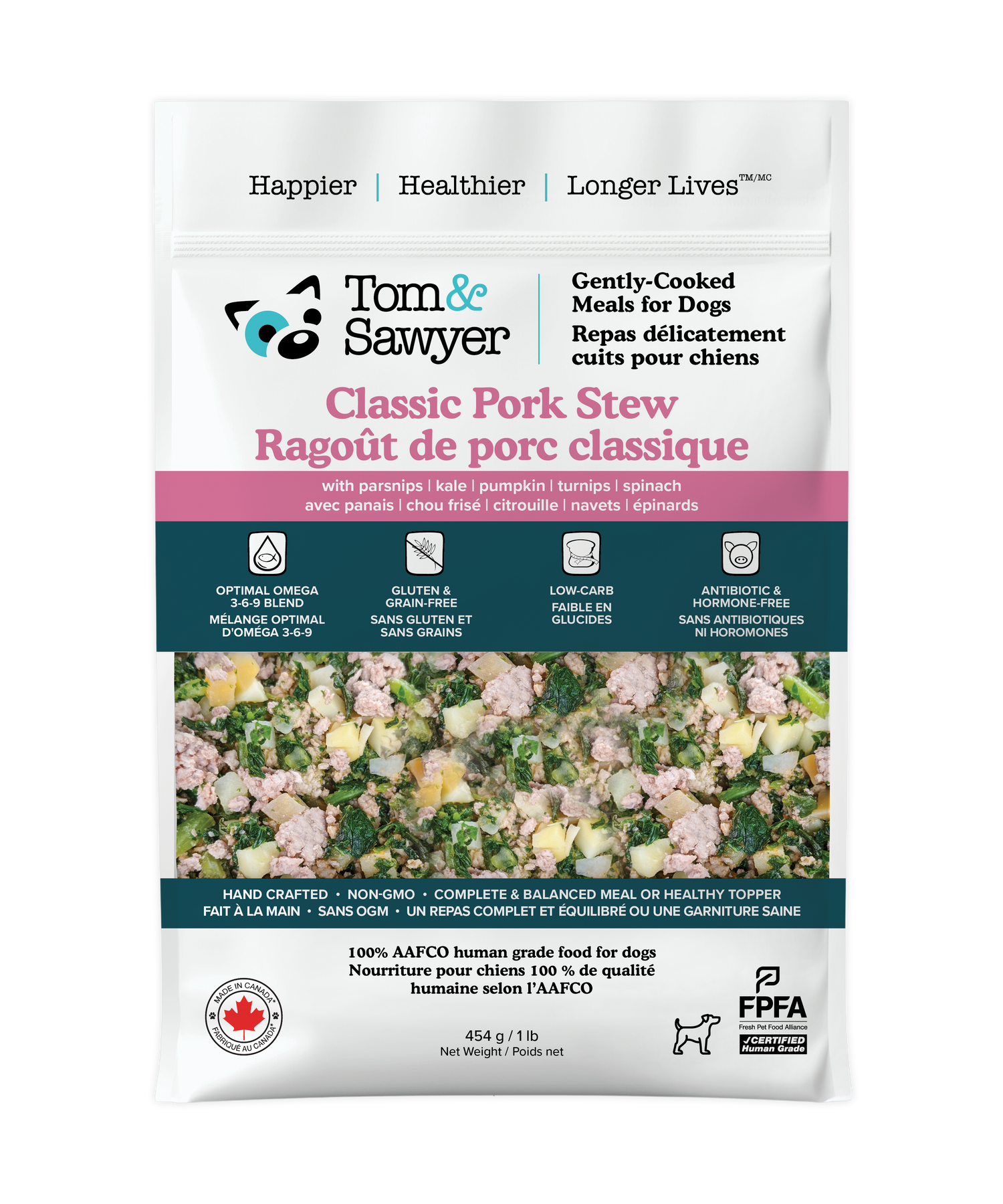 This nutrient-dense recipe is canine comfort food in a bowl, that's high in protein and low in carbs. Classic Pork Stew combines a variety of lip-smacking root vegetables like pumpkin, parsnip and turnip, along with kale and spinach to keep your pup healthy and happy.