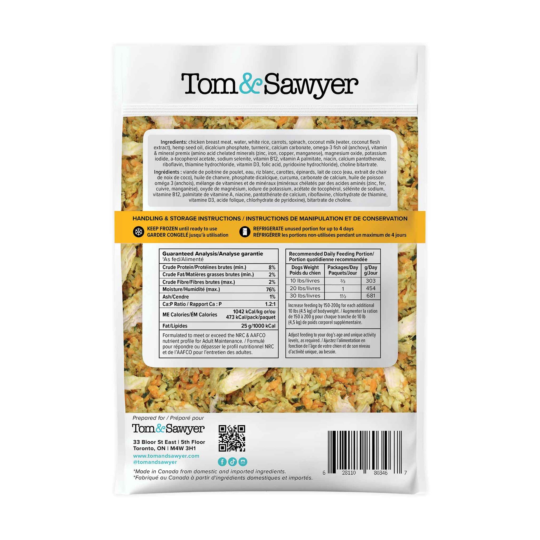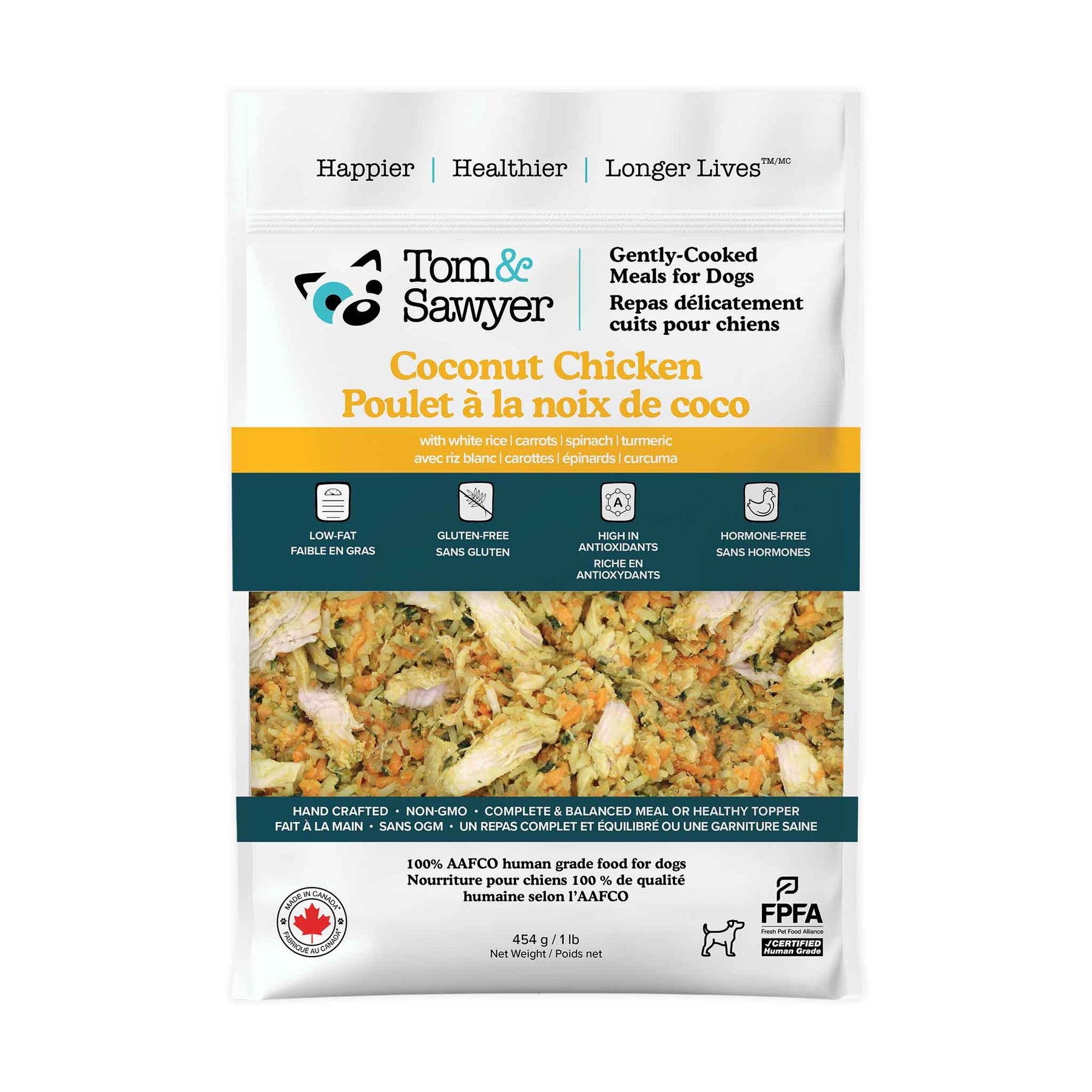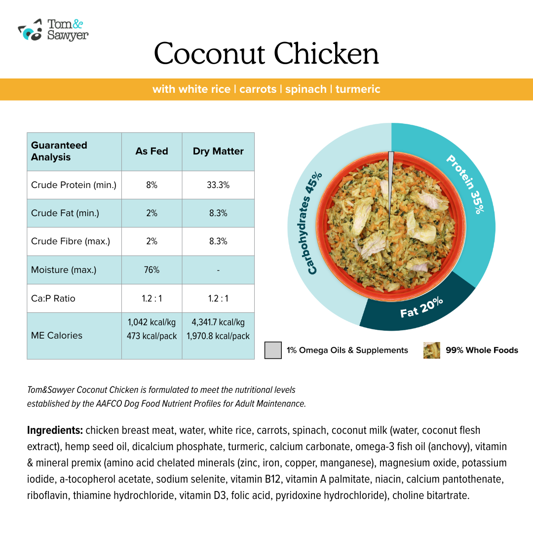 Tom&Sawyer Coconut Chicken is formulated to meet the nutritional levels established by the AAFCO Dog Food Nutrient Profiles for Adult Maintenance.