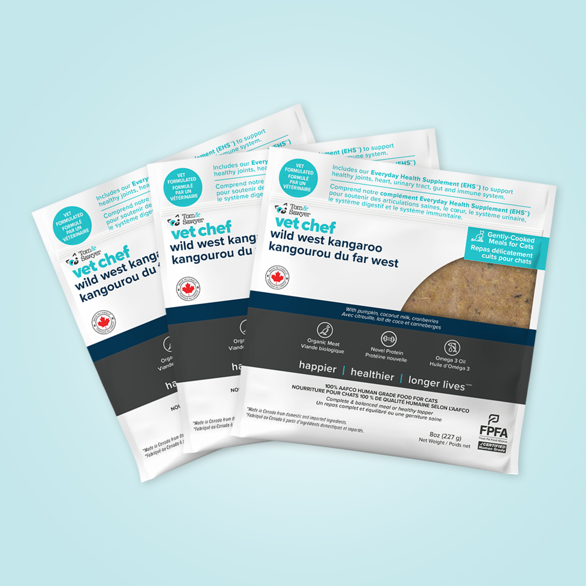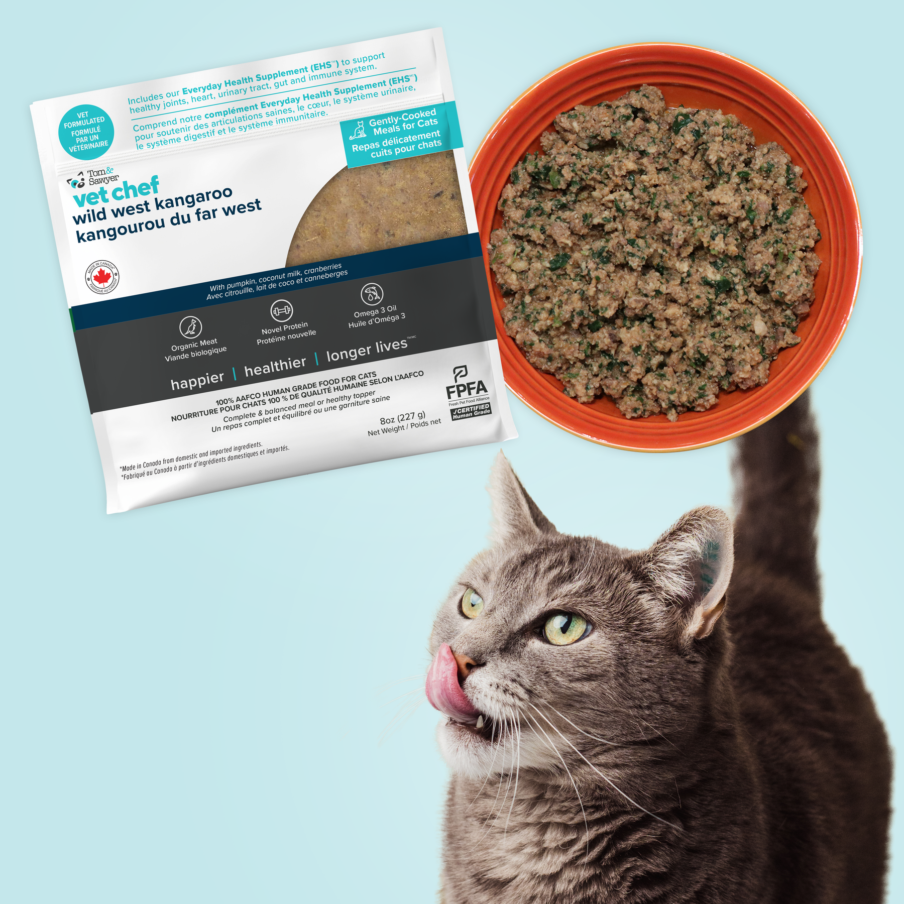 As with all Tom&Sawyer meals, we use human-grade, restaurant-quality ingredients, prepared in a Canadian HUMAN food facility—so your cat’s food is held to the same high standards as your own.