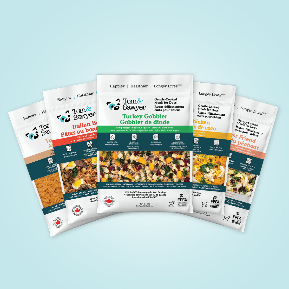 Tom&Sawyer meals are complete and balanced, gently-cooked pet food. Our meals are truly the definition of “human grade” in dog food. We source human-grade, restaurant quality ingredients, and prepare our meals in a Canadian HUMAN food facility! This means the same care, attention and regulations applied to your own food is standard for your fur baby’s meals too.